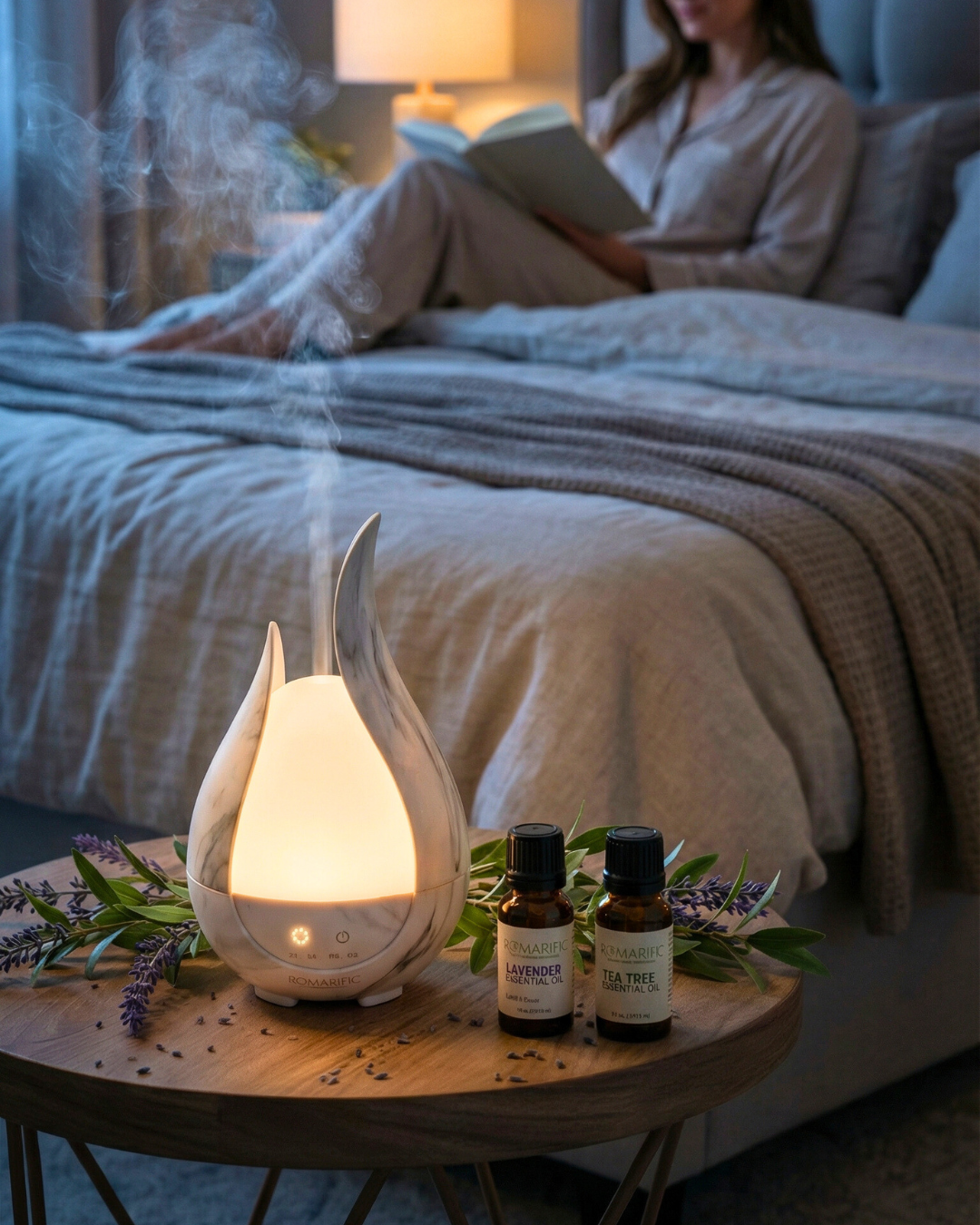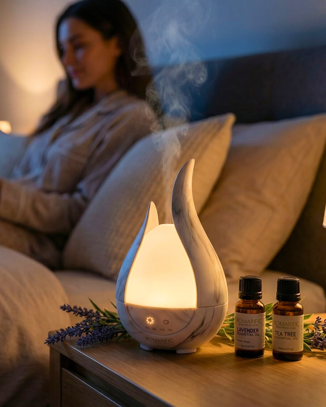 Romarific's aroma diffusers use ultrasonic technology to disperse a fine mist of water and essential oils into the air. This creates a soothing and aromatic atmosphere that can help improve your mood, reduce stress, and promote relaxation.