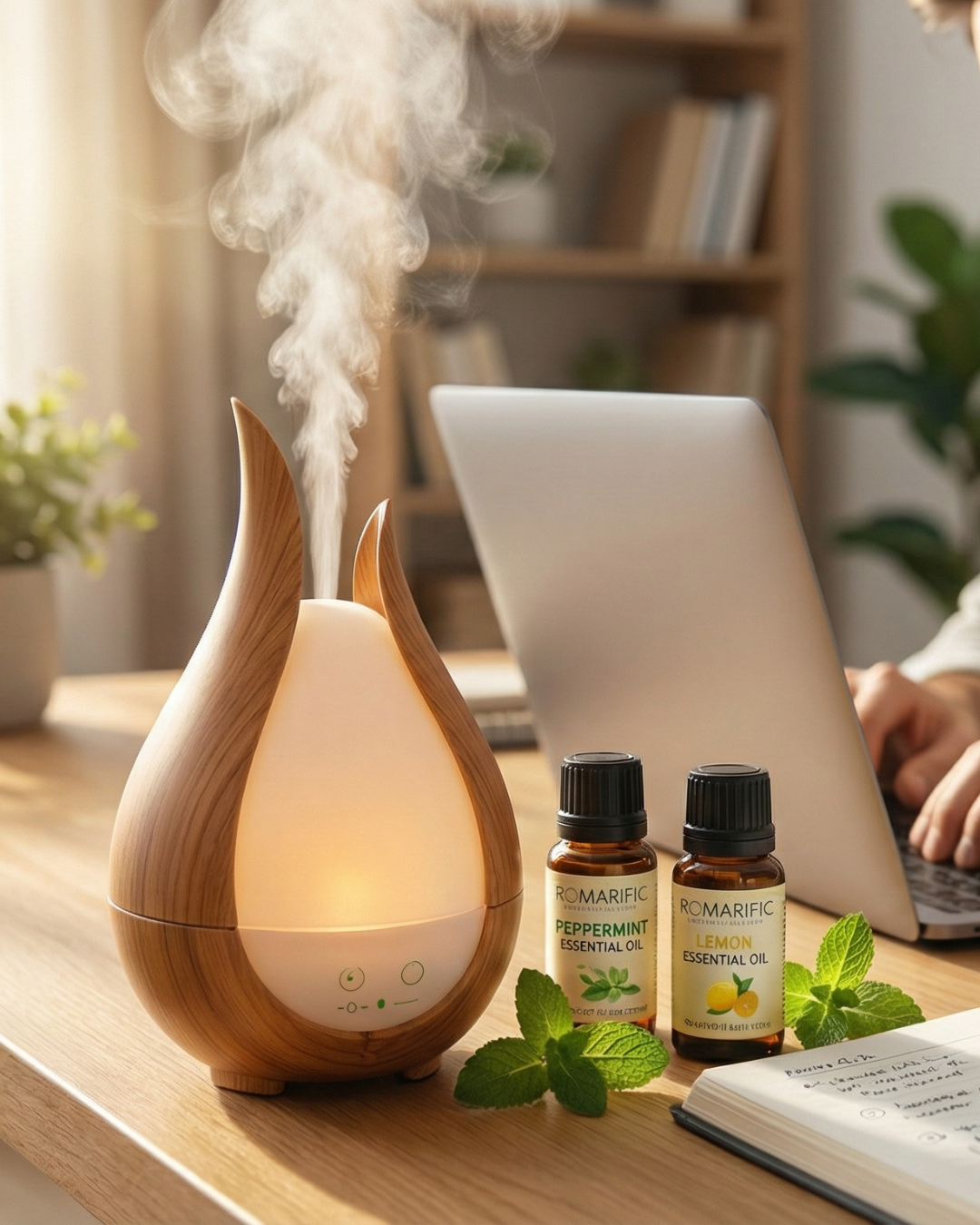 Romarific's aroma diffusers use ultrasonic technology to disperse a fine mist of water and essential oils into the air. This creates a soothing and aromatic atmosphere that can help improve your mood, reduce stress, and promote relaxation.